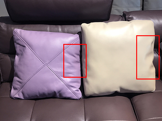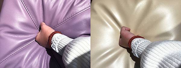 接下來我會用兩顆抱枕,一顆牛皮抱枕(紫色)和一顆合成皮抱枕(黃色)做示範,讓大家看看牛皮和合成皮的差異: