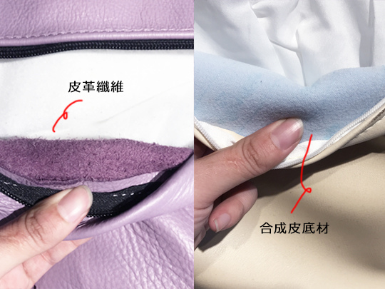 雖然合成皮技術已經相當成熟,但若將牛皮和合成皮放在一起比較,其手感及舒適度還是無法與牛皮比擬,單用文字難以敘述差異,建議親自到門市請業務拿樣本試摸看看,很快就可以分出兩者差異性囉,但試摸樣本時可以留意皮革底層,真皮底層是纖維,合成皮則有好幾種底材,例如網狀織布纖維等,可避免被不肖業者拿合成皮欺騙喔!