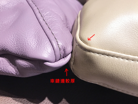 ▲通常牛皮的車縫邊會比合成皮厚,但仍有少部分合成皮的厚度是比較厚的,因此車縫邊只能作為參考依據,而非絕對。